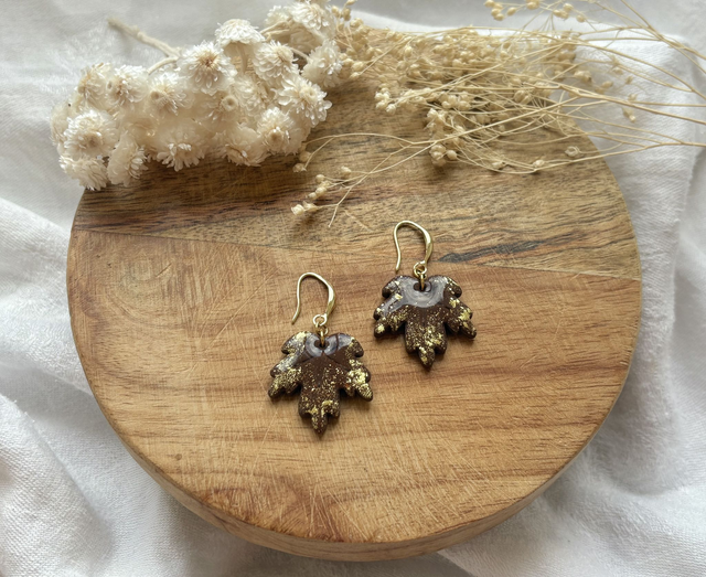 Boucles d'oreilles réalisées à la main en argile polymère, un modèle peut être créé en plusieurs exemplaires mais chaque paire est unique, Sur ce modèle la pâte est recouverte de véritables feuilles d'or. La finition brillante du bijou est faite de Résine UV. Les fermoirs utilisés pour cette paire sont en plaqué or. Chaque bijou est réalisé à la main dans un atelier de Bourgogne.