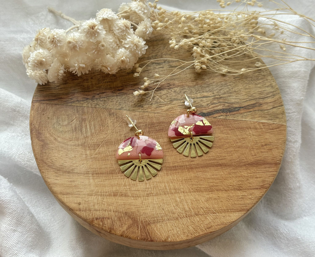 Boucles d'oreilles réalisées à la main en argile polymère, un modèle peut être créé en plusieurs exemplaires mais chaque paire est unique, Sur ce modèle la pâte est recouverte de véritables feuilles d'or. La finition brillante du bijou est faite de Résine UV. Les fermoirs utilisés pour cette paire sont en plaqué or et la breloque en acier inoxydable. Chaque bijou est réalisé à la main dans un atelier de Bourgogne.