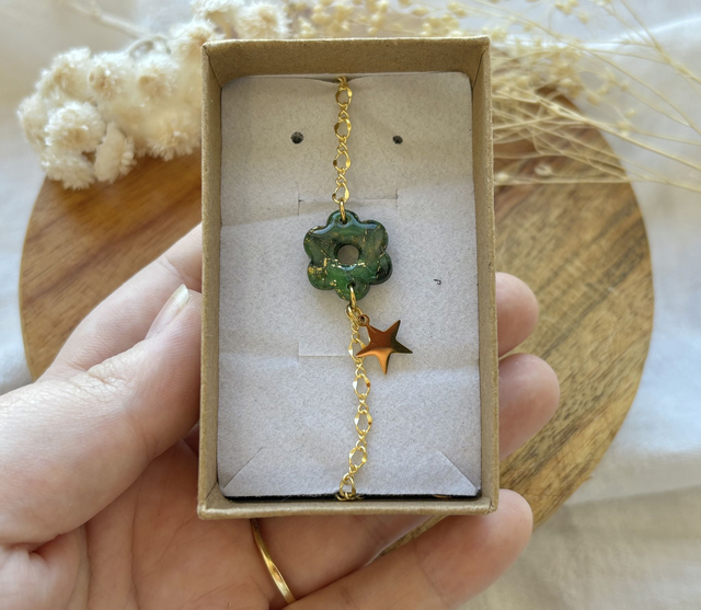 Bracelets réalisées à la main en argile polymère, un modèle peut être créé en plusieurs exemplaires mais chaque paire est unique, Sur ce modèle la pâte est recouverte de véritables feuilles d'or. La finition brillante du bijou est faite de Résine UV. La chaine utilisé pour ce bracelet est en plaqué or et la breloque en acier inoxydable. Chaque bijou est réalisé à la main dans un atelier de Bourgogne.