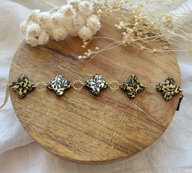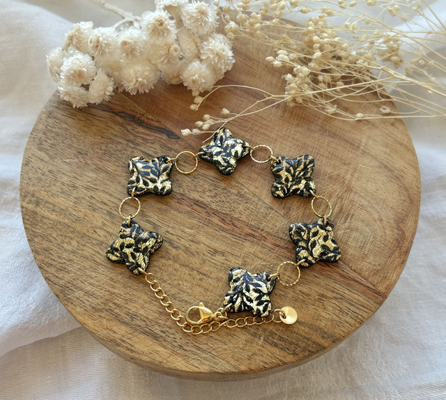 Bracelets réalisées à la main en pâte polymère, un modèle peut être créé en plusieurs exemplaires mais chaque paire est unique, Sur ce modèle la pâte est recouverte de véritables feuilles d'or. La finition brillante du bijou est faite de Résine UV. Le bracelet est en acier inoxydable. Chaque bijou est réalisé à la main dans un atelier de Bourgogne.