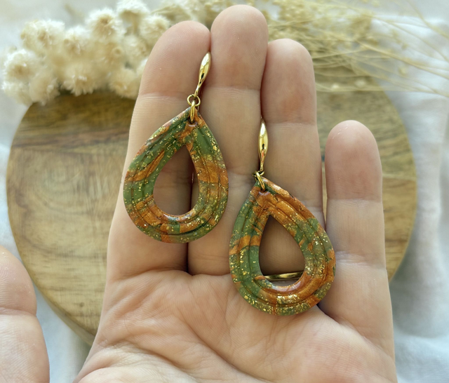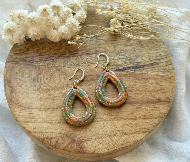 Boucles d'oreilles réalisées à la main en argile polymère, un modèle peut être créé en plusieurs exemplaires mais chaque paire est unique, Sur ce modèle la pâte est recouverte de véritables feuilles d'or. La finition brillante du bijou est faite de Résine UV. Les fermoirs utilisés pour cette paire sont en plaqué or. Chaque bijou est réalisé à la main dans un atelier de Bourgogne.