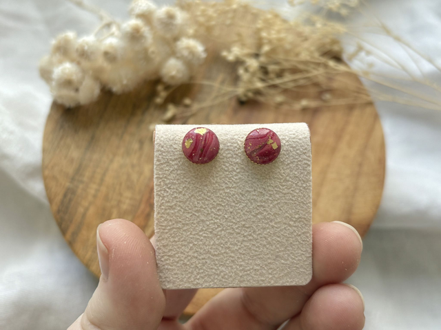 Boucles d'oreilles réalisées à la main en argile polymère, un modèle peut être créé en plusieurs exemplaires mais chaque paire est unique. Ce modèle contient de la feuille d'or. La finition brillante du bijou est faite de Résine UV. Les fermoirs utilisés pour cette paire sont en acier inoxydable. Chaque bijou est réalisé à la main dans un atelier de Bourgogne.