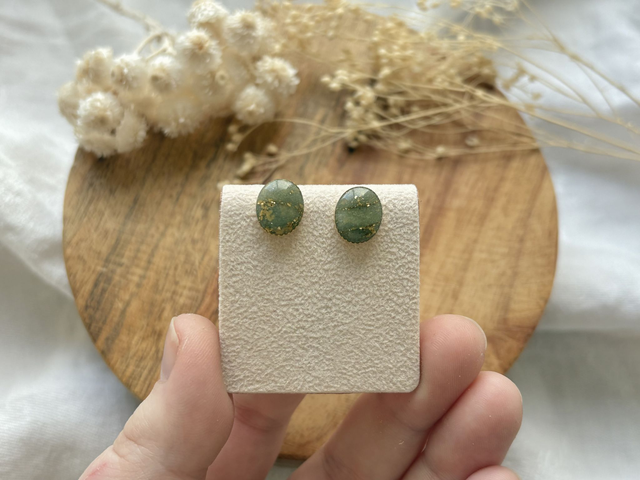 Boucles d'oreilles réalisées à la main en argile polymère, un modèle peut être créé en plusieurs exemplaires mais chaque paire est unique. Ce modèle contient de la feuille d'or. La finition brillante du bijou est faite de Résine UV. Les fermoirs utilisés pour cette paire sont en acier inoxydable. Chaque bijou est réalisé à la main dans un atelier de Bourgogne.