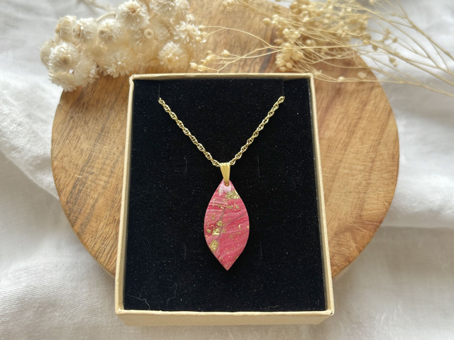 Collier réalisé à la main en pâte polymère, un modèle peut être créé en plusieurs exemplaires mais chaque bijou est unique. La chaine du collier mesure 42cm environ. Sur ce modèle la pâte contient de la feuille d'or. La finition brillante du bijou est faite de Résine UV. La chaine du collier est en acier inoxydable ainsi que la bélière et le mousqueton. Chaque bijou est réalisé à la main dans un atelier de Bourgogne.