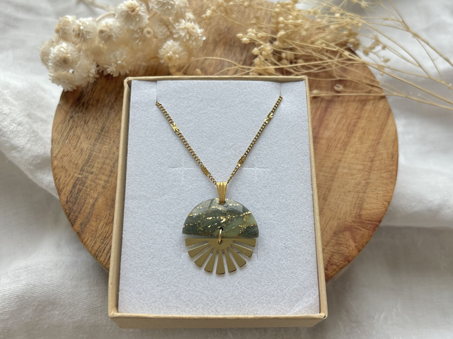 Collier réalisé à la main en pâte polymère, un modèle peut être créé en plusieurs exemplaires mais chaque bijou est unique. La chaine du collier mesure 42cm environ. Sur ce modèle la pâte contient de la feuille d'or. La finition brillante du bijou est faite de Résine UV. La chaine du collier est en acier inoxydable ainsi que la bélière et le mousqueton. Chaque bijou est réalisé à la main dans un atelier de Bourgogne.