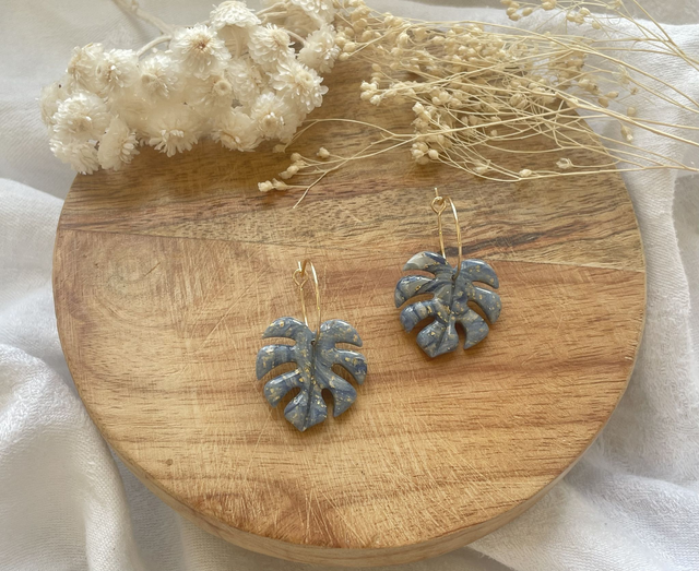 Boucles d'oreilles réalisées à la main en argile polymère, un modèle peut être créé en plusieurs exemplaires mais chaque paire est unique, Sur ce modèle la pâte est recouverte de véritables feuilles d'or. La finition brillante du bijou est faite de Résine UV. Les fermoirs utilisés pour cette paire sont en plaqué or. Chaque bijou est réalisé à la main dans un atelier de Bourgogne.