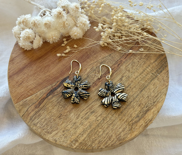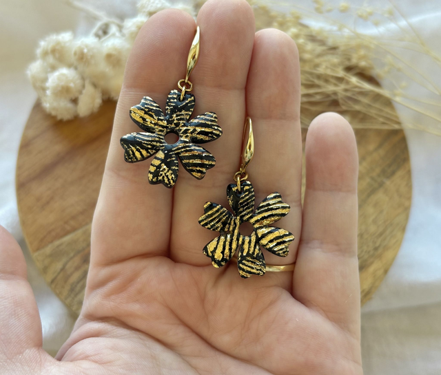 Boucles d'oreilles réalisées à la main en argile polymère, un modèle peut être créé en plusieurs exemplaires mais chaque paire est unique, Sur ce modèle la pâte est recouverte de véritables feuilles d'or. La finition brillante du bijou est faite de Résine UV.
