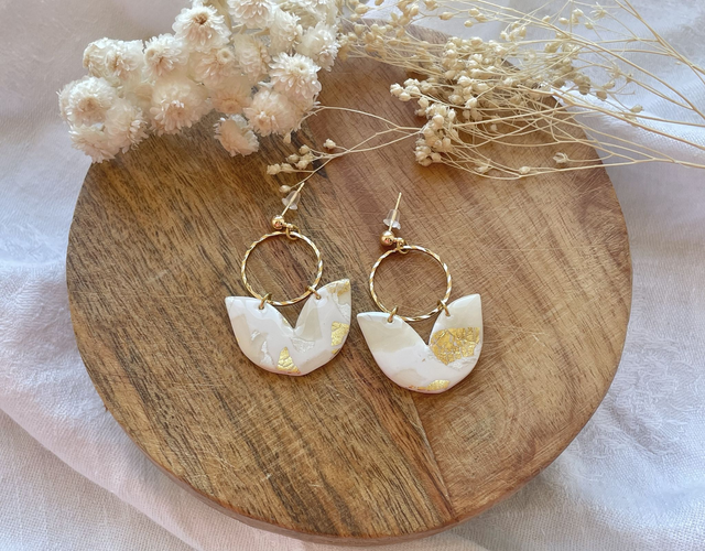 Boucles d'oreilles réalisées à la main en argile polymère, un modèle peut être créé en plusieurs exemplaires mais chaque paire est unique, Sur ce modèle la pâte est recouverte de véritables feuilles d'or. La finition brillante du bijou est faite de Résine UV. Les fermoirs utilisés pour cette paire sont en plaqué or et la breloque en acier inoxydable. Chaque bijou est réalisé à la main dans un atelier de Bourgogne.