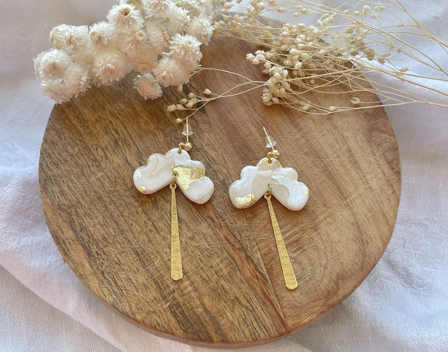 Boucles d'oreilles réalisées à la main en argile polymère, un modèle peut être créé en plusieurs exemplaires mais chaque paire est unique, Sur ce modèle la pâte est recouverte de véritables feuilles d'or. La finition brillante du bijou est faite de Résine UV. Les fermoirs utilisés pour cette paire sont en plaqué or et la breloque en acier inoxydable. Chaque bijou est réalisé à la main dans un atelier de Bourgogne.