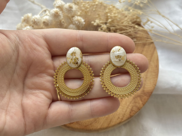 Ce modèle contient de la feuille d'or. La finition brillante du bijou est faite de Résine UV.