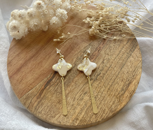 Boucles d'oreilles réalisées à la main en argile polymère, un modèle peut être créé en plusieurs exemplaires mais chaque paire est unique, Sur ce modèle la pâte est recouverte de véritables feuilles d'or. La finition brillante du bijou est faite de Résine UV. Les fermoirs utilisés pour cette paire sont en plaqué or et la breloque en acier inoxydable. Chaque bijou est réalisé à la main dans un atelier de Bourgogne.