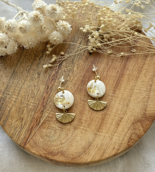 Boucles d'oreilles réalisées à la main en argile polymère, un modèle peut être créé en plusieurs exemplaires mais chaque paire est unique, Sur ce modèle la pâte est recouverte de feuilles d'or.