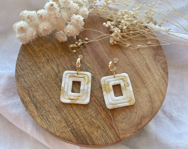 Boucles d'oreilles réalisées à la main en argile polymère, un modèle peut être créé en plusieurs exemplaires mais chaque paire est unique, Sur ce modèle la pâte est recouverte de véritables feuilles d'or. La finition brillante du bijou est faite de Résine UV. Les fermoirs utilisés pour cette paire sont en plaqué or. Chaque bijou est réalisé à la main dans un atelier de Bourgogne.