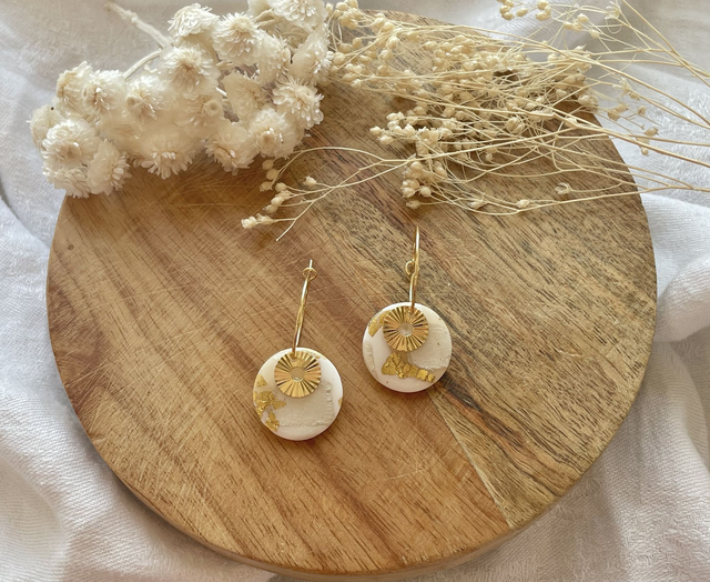 Boucles d'oreilles réalisées à la main en argile polymère, un modèle peut être créé en plusieurs exemplaires mais chaque paire est unique, Sur ce modèle la pâte est recouverte de véritables feuilles d'or. La finition brillante du bijou est faite de Résine UV. Les fermoirs utilisés pour cette paire sont en plaqué or et la breloque en acier inoxydable. Chaque bijou est réalisé à la main dans un atelier de Bourgogne.