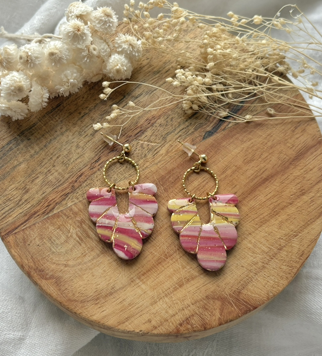 Boucles d'oreilles réalisées à la main en argile polymère, un modèle peut être créé en plusieurs exemplaires mais chaque paire est unique, Sur ce modèle la pâte est recouverte de feuilles d'or.