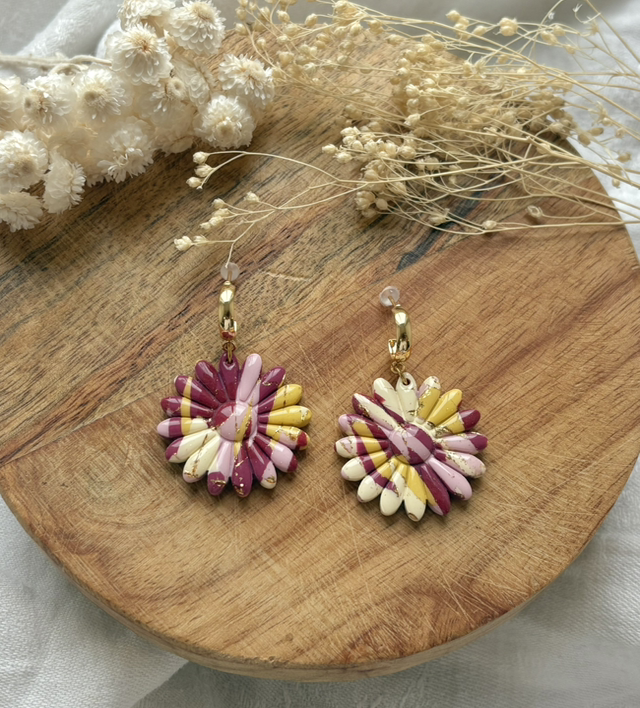 Boucles d'oreilles réalisées à la main en argile polymère, un modèle peut être créé en plusieurs exemplaires mais chaque paire est unique, Sur ce modèle la pâte est recouverte de feuilles d'or.