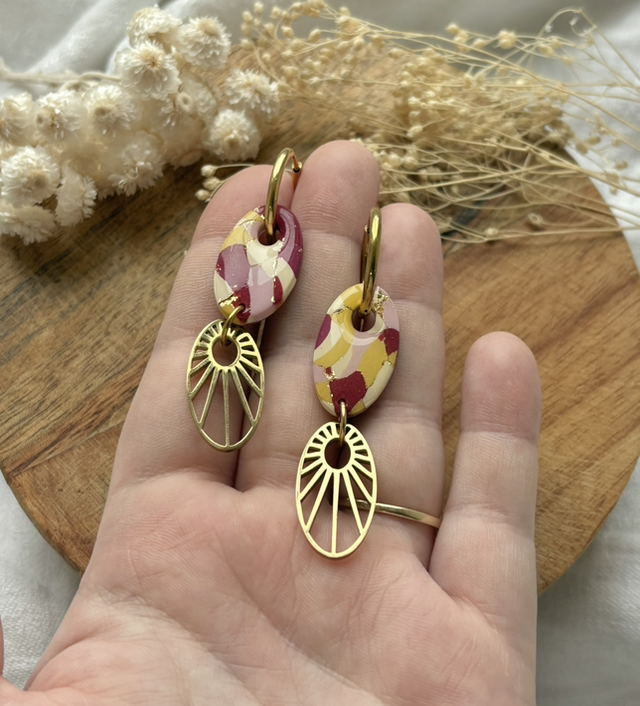 Boucles d'oreilles réalisées à la main en argile polymère, un modèle peut être créé en plusieurs exemplaires mais chaque paire est unique, Sur ce modèle la pâte est recouverte de feuilles d'or.