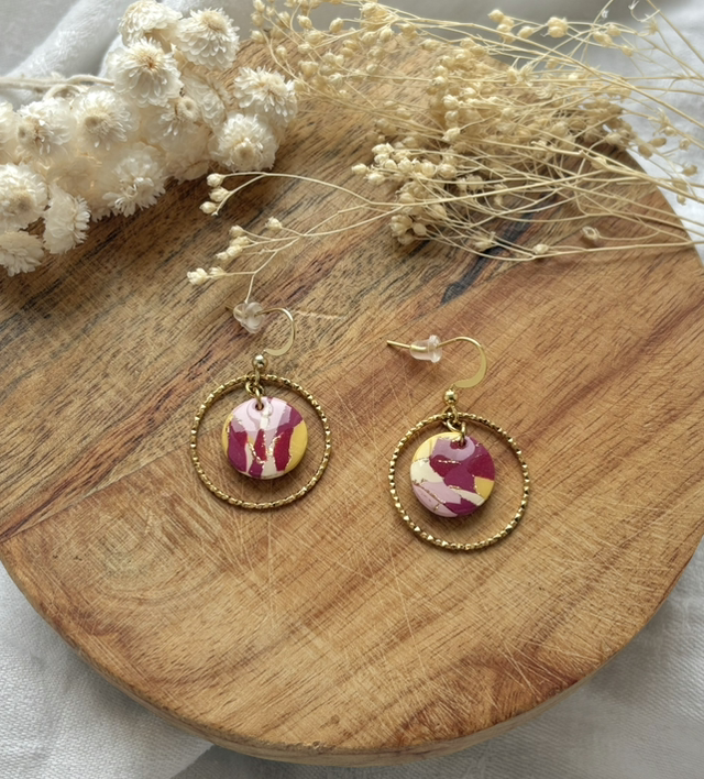 Boucles d'oreilles réalisées à la main en argile polymère, un modèle peut être créé en plusieurs exemplaires mais chaque paire est unique, Sur ce modèle la pâte est recouverte de feuilles d'or.