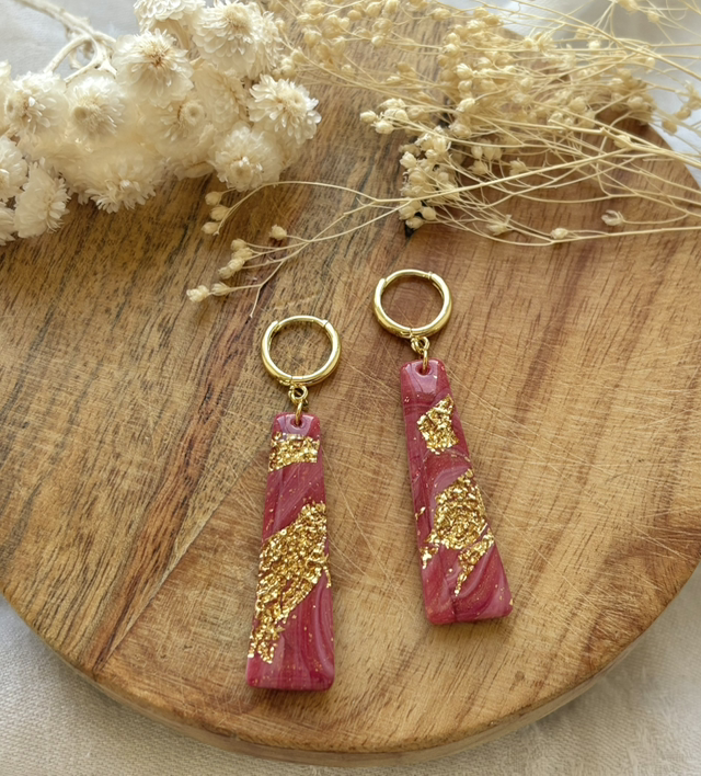 Boucles d'oreilles réalisées à la main en argile polymère, un modèle peut être créé en plusieurs exemplaires mais chaque paire est unique, Sur ce modèle la pâte est recouverte de feuilles d'or.