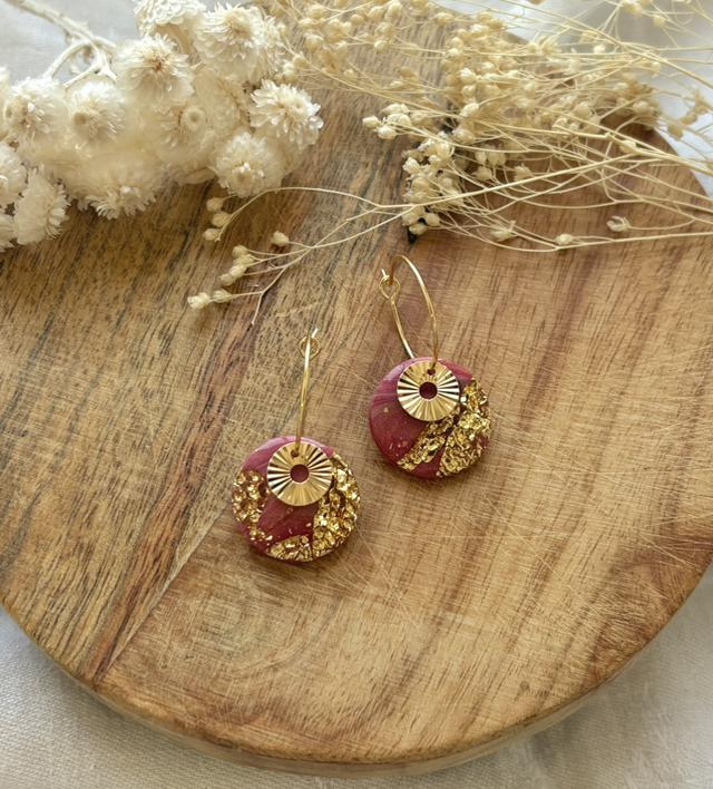 Boucles d'oreilles réalisées à la main en argile polymère, un modèle peut être créé en plusieurs exemplaires mais chaque paire est unique, Sur ce modèle la pâte est recouverte de feuilles d'or.