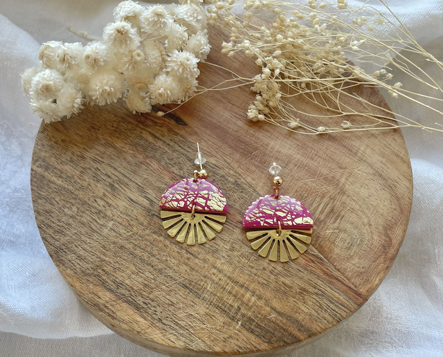 Boucles d'oreilles réalisées à la main en argile polymère, un modèle peut être créé en plusieurs exemplaires mais chaque paire est unique, Sur ce modèle la pâte est recouverte de véritables feuilles d'or. La finition brillante du bijou est faite de Résine UV. Les fermoirs utilisés pour cette paire sont en plaqué or ainsi que la breloque. Chaque bijou est réalisé à la main dans un atelier de Bourgogne.