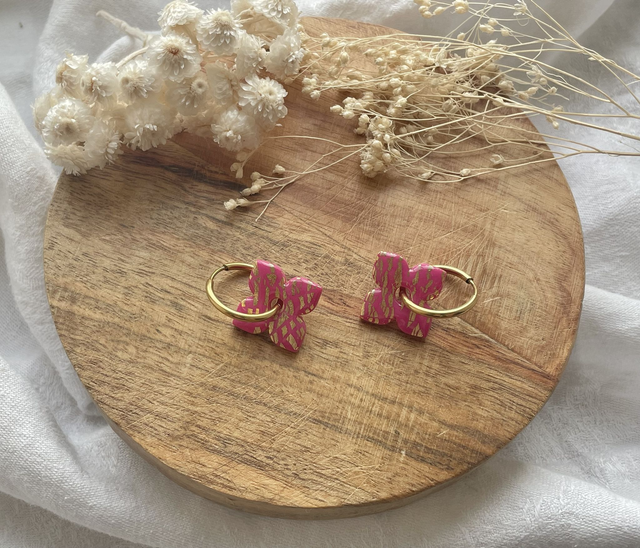 Boucles d'oreilles réalisées à la main en argile polymère, un modèle peut être créé en plusieurs exemplaires mais chaque paire est unique, Sur ce modèle la pâte est recouverte de véritables feuilles d'or. La finition brillante du bijou est faite de Résine UV. Les fermoirs utilisés pour cette paire sont en acier inoxydable. Chaque bijou est réalisé à la main dans un atelier de Bourgogne.