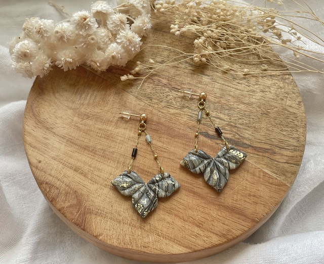Boucles d'oreilles réalisées à la main en argile polymère, un modèle peut être créé en plusieurs exemplaires mais chaque paire est unique, Sur ce modèle la pâte est recouverte de véritables feuilles d'or. La finition brillante du bijou est faite de Résine UV. Les fermoirs utilisés pour cette paire sont en plaqué or. Chaque bijou est réalisé à la main dans un atelier de Bourgogne.
