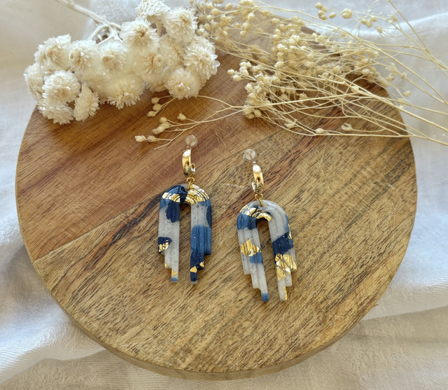 Boucles d'oreilles réalisées à la main en argile polymère, un modèle peut être créé en plusieurs exemplaires mais chaque paire est unique, Sur ce modèle la pâte est recouverte de véritables feuilles d'or. La finition brillante du bijou est faite de Résine UV. Les fermoirs utilisés pour cette paire sont en plaqué or. Chaque bijou est réalisé à la main dans un atelier de Bourgogne.