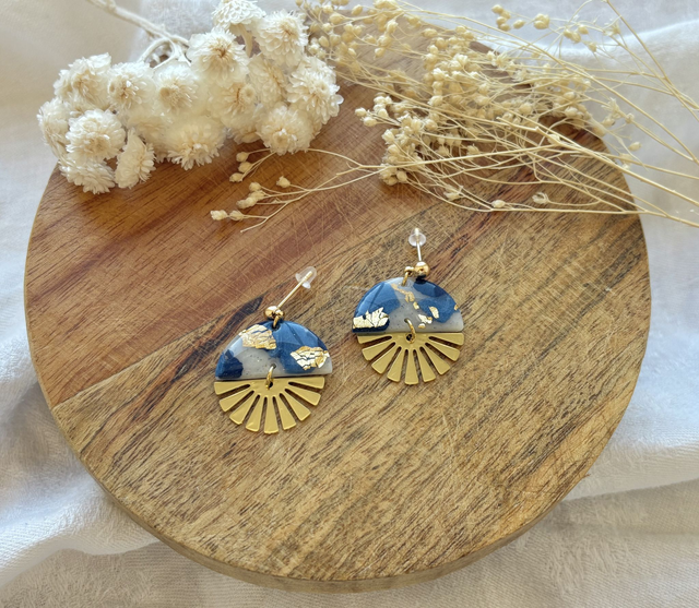Boucles d'oreilles réalisées à la main en argile polymère, un modèle peut être créé en plusieurs exemplaires mais chaque paire est unique, Sur ce modèle la pâte est recouverte de véritables feuilles d'or. La finition brillante du bijou est faite de Résine UV. Les fermoirs utilisés pour cette paire sont en plaqué or et la breloque en acier inoxydable. Chaque bijou est réalisé à la main dans un atelier de Bourgogne.