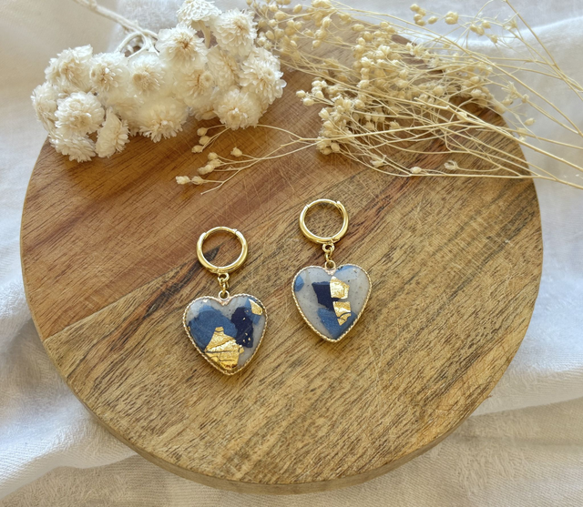Boucles d'oreilles réalisées à la main en argile polymère, un modèle peut être créé en plusieurs exemplaires mais chaque paire est unique, Sur ce modèle la pâte est recouverte de véritables feuilles d'or. La finition brillante du bijou est faite de Résine UV. Les fermoirs utilisés pour cette paire sont en plaqué or. Chaque bijou est réalisé à la main dans un atelier de Bourgogne.