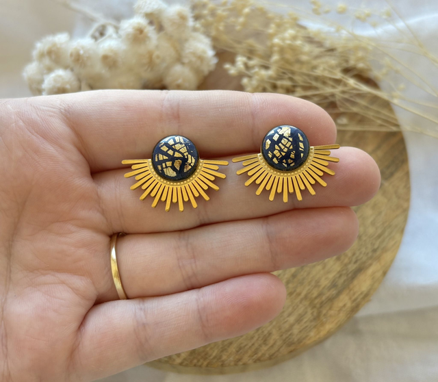 Boucles d'oreilles réalisées à la main en argile polymère, un modèle peut être créé en plusieurs exemplaires mais chaque paire est unique, Sur ce modèle la pâte est recouverte de véritables feuilles d'or. La finition brillante du bijou est faite de Résine UV. Les fermoirs utilisés pour cette paire sont en acier inoxydable. Chaque bijou est réalisé à la main dans un atelier de Bourgogne.