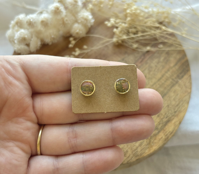 Boucles d'oreilles réalisées à la main en argile polymère, un modèle peut être créé en plusieurs exemplaires mais chaque paire est unique, Sur ce modèle la pâte est recouverte de véritables feuilles d'or. La finition brillante du bijou est faite de Résine UV. Les fermoirs utilisés pour cette paire sont en acier inoxydable. Chaque bijou est réalisé à la main dans un atelier de Bourgogne.