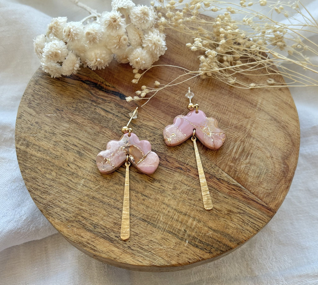 Boucles d'oreilles réalisées à la main en pâte polymère, un modèle peut être créé en plusieurs exemplaires mais chaque paire est unique, Sur ce modèle la pâte est recouverte de véritables feuilles d'or. La finition brillante du bijou est faite de Résine UV. Les fermoirs utilisés pour cette paire sont en plaqué or et la breloque en acier inoxydable. Chaque bijou est réalisé à la main dans un atelier de Bourgogne.