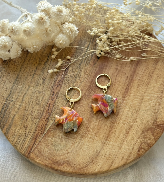 Boucles d'oreilles réalisées à la main en argile polymère, un modèle peut être créé en plusieurs exemplaires mais chaque paire est unique, Sur ce modèle la pâte est recouverte de feuilles d'or.