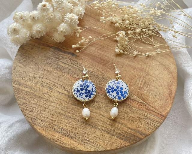 Boucles d'oreilles réalisées à la main en argile polymère, un modèle peut être créé en plusieurs exemplaires mais chaque paire est unique. Ce modèle contient de véritables perles d'eau douce. La finition brillante du bijou est faite de Résine UV. Les fermoirs utilisés pour cette paire sont en plaqué or. Chaque bijou est réalisé à la main dans un atelier de Bourgogne