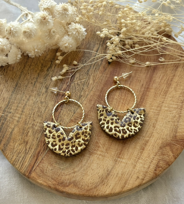 Boucles d'oreilles réalisées à la main en argile polymère, un modèle peut être créé en plusieurs exemplaires mais chaque paire est unique, Sur ce modèle la pâte est recouverte de feuilles d'or.