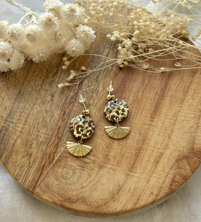 Boucles d'oreilles réalisées à la main en argile polymère, un modèle peut être créé en plusieurs exemplaires mais chaque paire est unique, Sur ce modèle la pâte est recouverte de feuilles d'or.