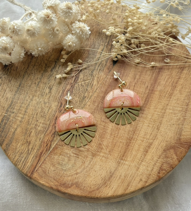 Boucles d'oreilles réalisées à la main en argile polymère, un modèle peut être créé en plusieurs exemplaires mais chaque paire est unique, Sur ce modèle la pâte est recouverte de feuilles d'or.