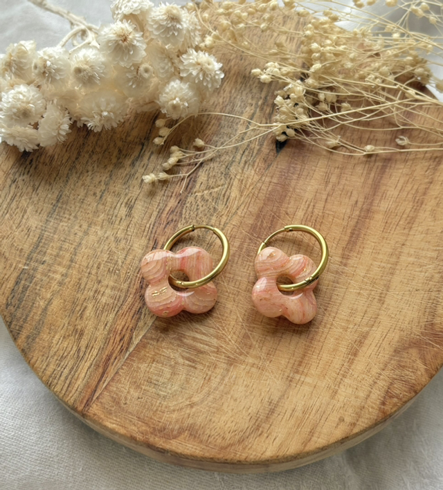 Boucles d'oreilles réalisées à la main en argile polymère, un modèle peut être créé en plusieurs exemplaires mais chaque paire est unique, Sur ce modèle la pâte est recouverte de feuilles d'or.
