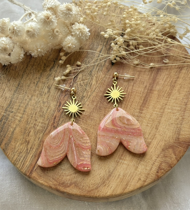 Boucles d'oreilles réalisées à la main en argile polymère, un modèle peut être créé en plusieurs exemplaires mais chaque paire est unique, Sur ce modèle la pâte est recouverte de feuilles d'or.